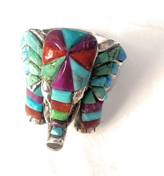 Handmade Elephant Sterling Silver & Multi Stone Inlay Forward Facing Elephant Elephant Ring | Size 7.5