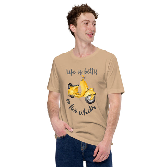 Light Colored Unisex t-shirt Travel Shirt, Wanderlust Tee, Life is Better on Two Wheels Yellow Scooter T-shirt, Adventure-Ready Cotton Shirt