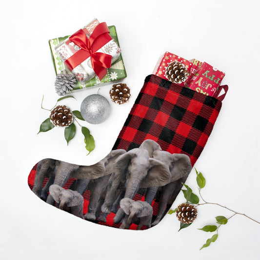 Red and Black Elephant Christmas Stocking - African Elephant Family on Buffalo Print Christmas Stocking