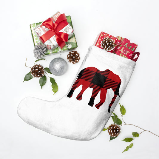 White Christmas Elephant Stocking Christmas Stocking with Elephant Buffalo Print, Red and Black Elephant on Christmas Stocking