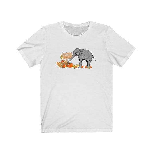 Happy Fall Elephant Shirt with Pumpkins - Unisex Jersey Short Sleeve Elephant Tee with Pumpkins and Autumn Leaves