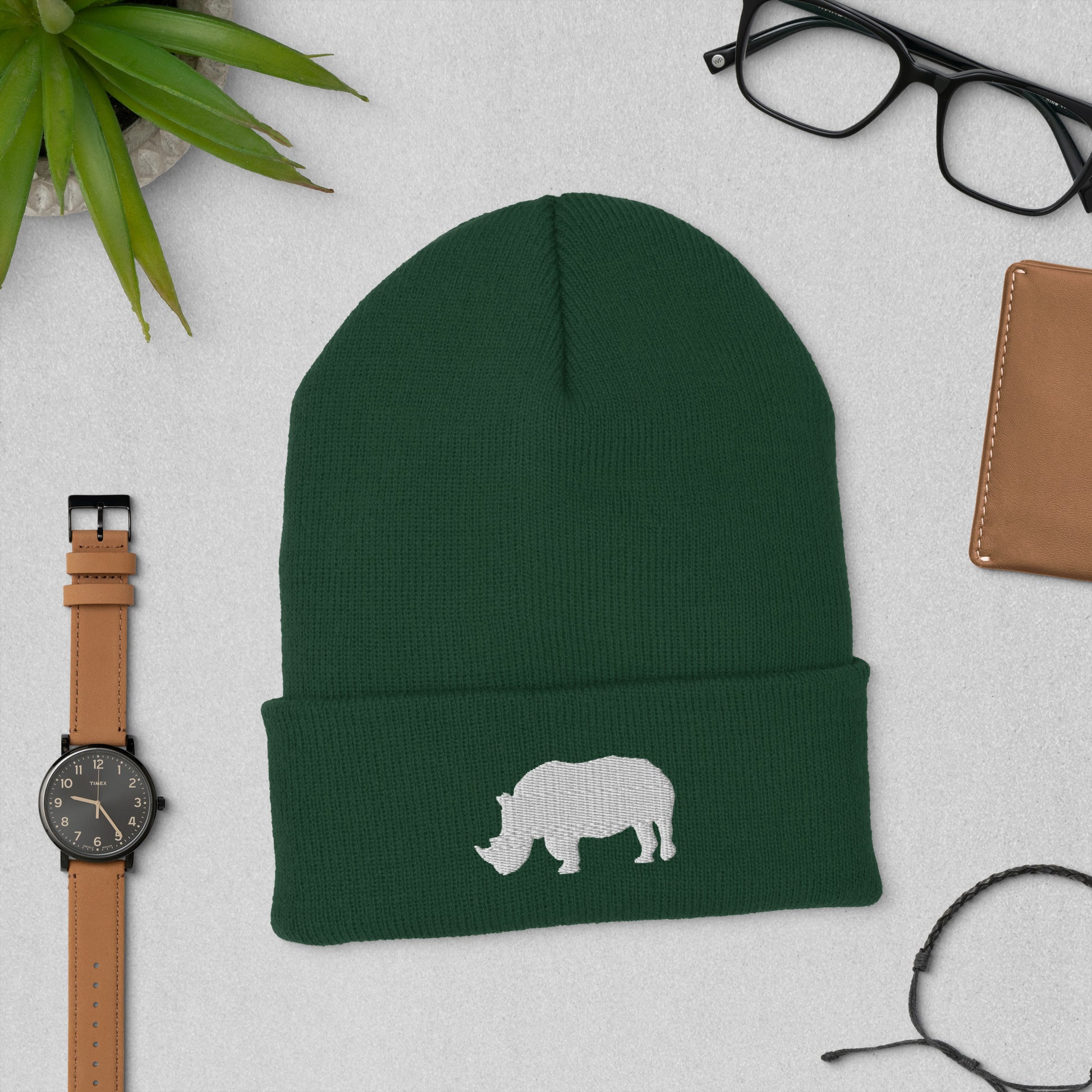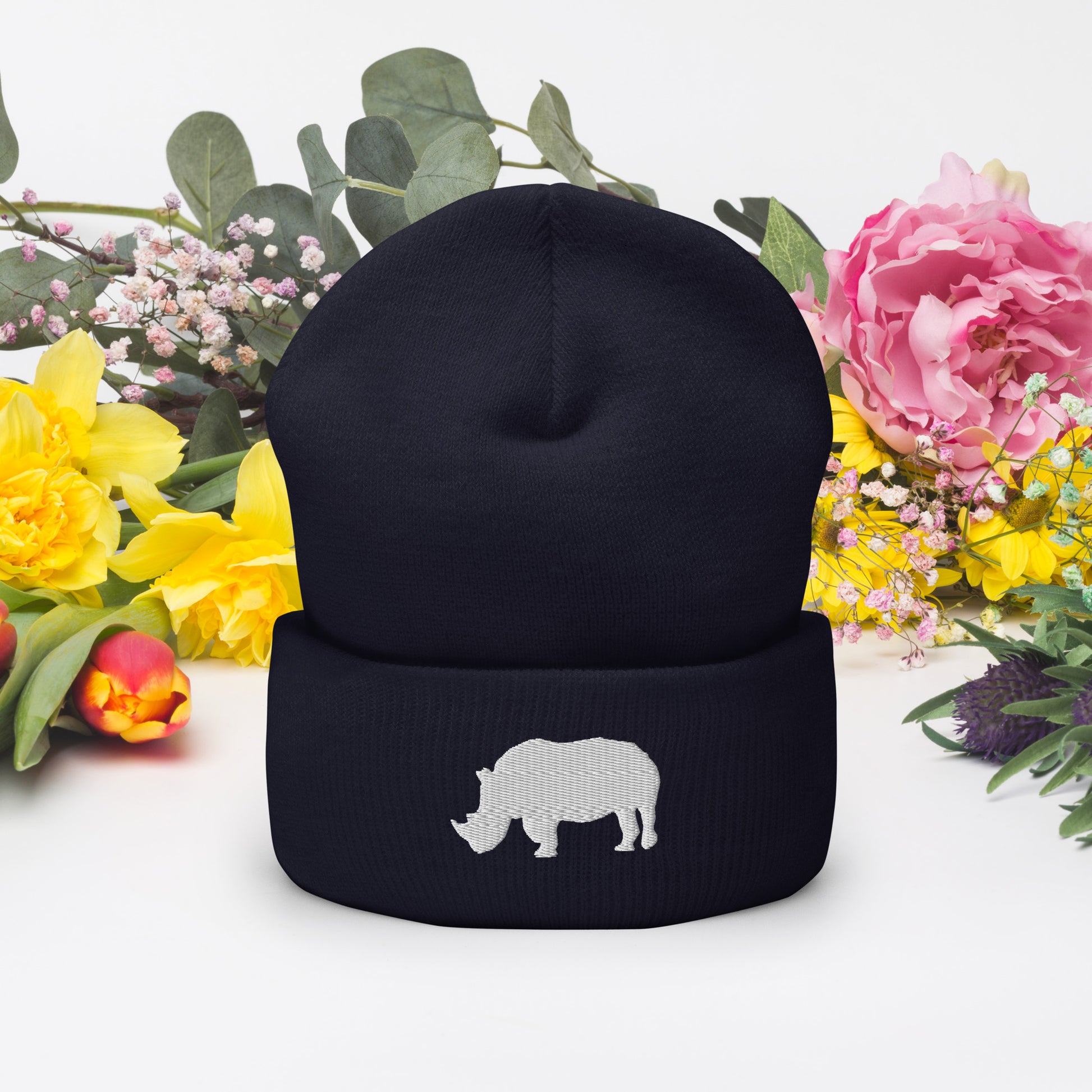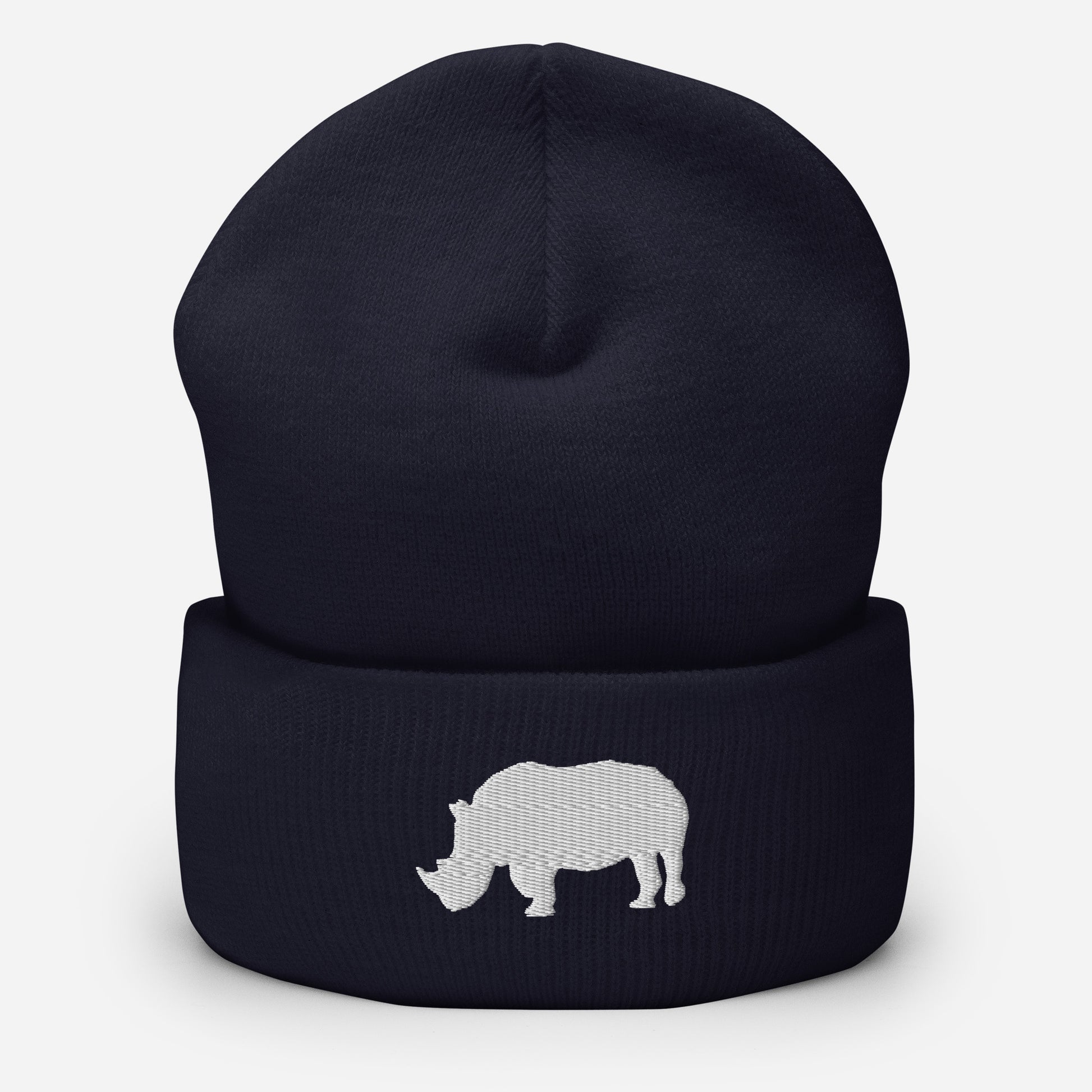 Embroidered White Rhino Cuffed Beanie, Adult Black Beanie with White Rhino, Rhino Beanie Navy, Cool Rhino Beanie, Animal Beanie, Safari Beanie