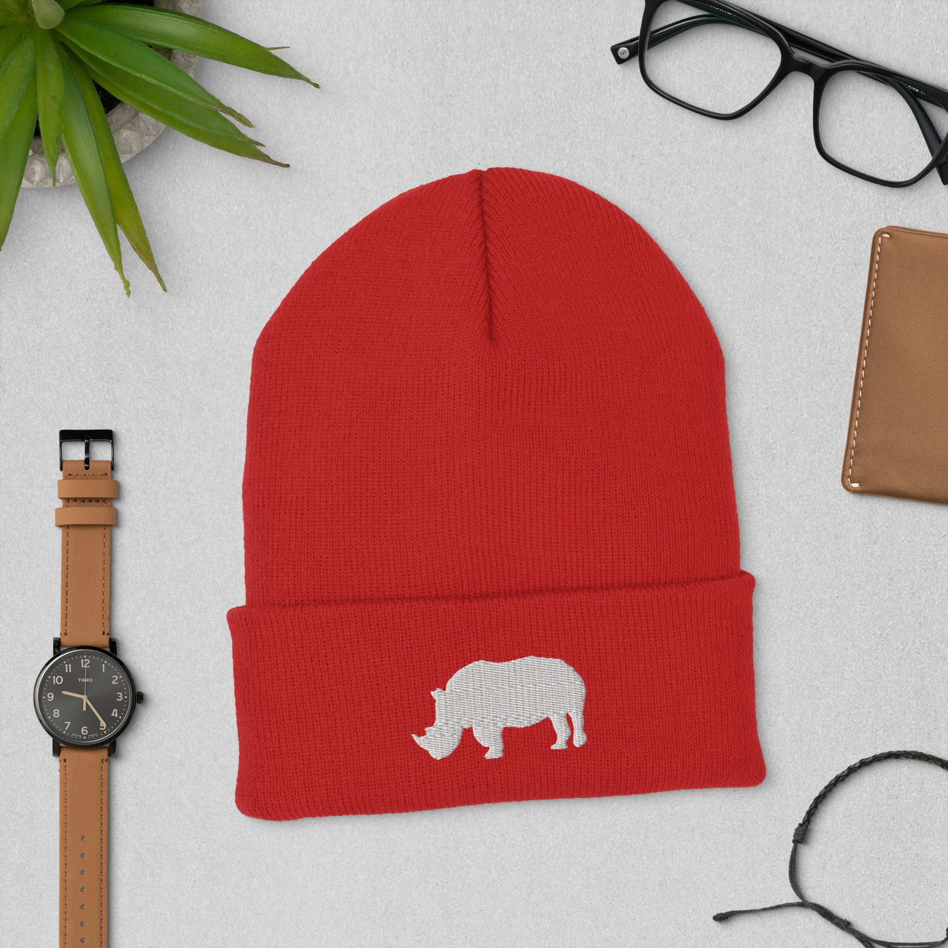 Bestselling animal beanie because of the design and comfort! Our cuffed Elephant beanie is very popular during the cooler months of the year. It is stylish, snug, and form-fitting. It's not only a great head-warming piece, but a staple accessory you need in your wardrobe. The white rhino on this beanie is embroidered in white thread and the it will look amazing on you!