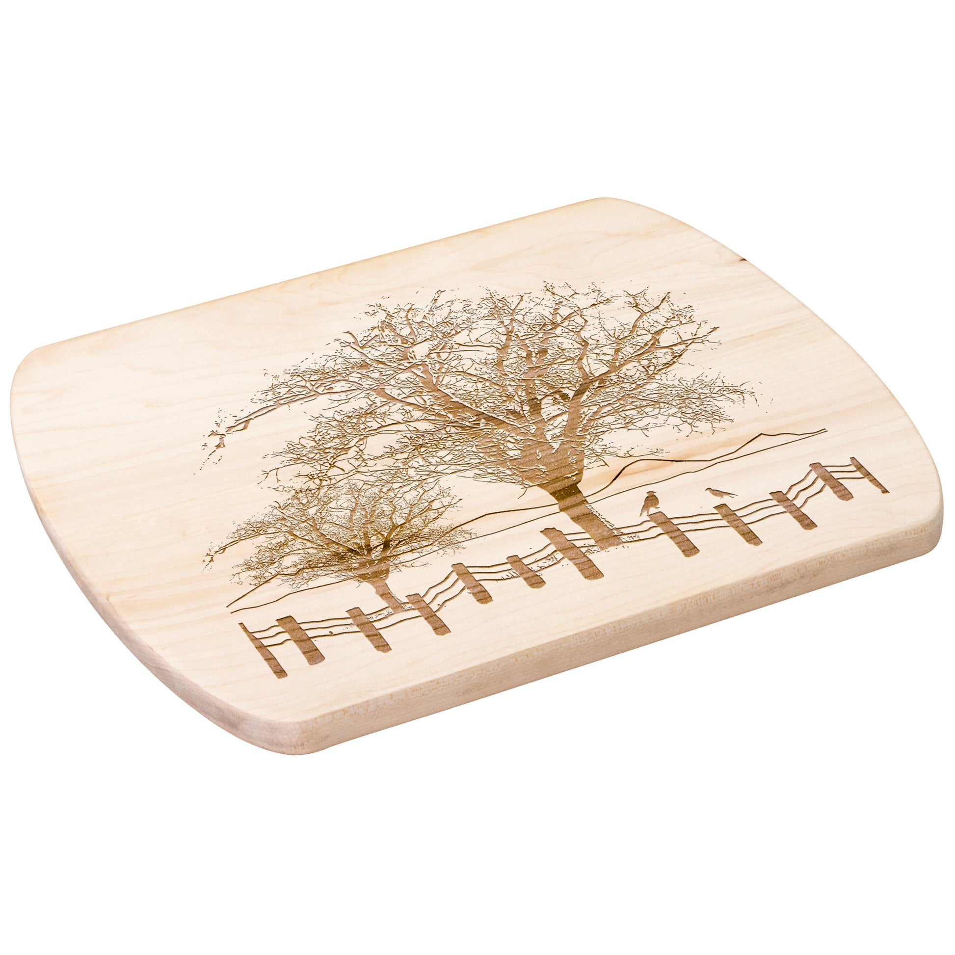 Our cutting boards boast a stylish and unique design featuring two bare and leafless trees, a picket fence by the farm, and two birds chatting as prints on the boards. This adds a touch of charm to any kitchen and makes them a statement piece. Whether you're preparing grandma’s famous lasagna or some freshly baked cookies, our cutting boards can handle anything and are built to last.